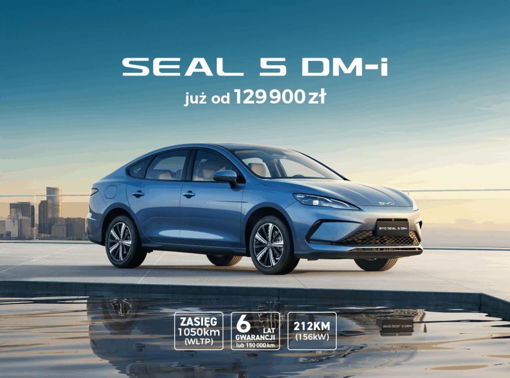Poznaj limuzynę, która redefiniuje pojęcie codziennej mobilności. SEAL 5 DM-i to zaawansowana hybryda z technologią Super DM, oferująca do 100 km jazdy elektrycznej (WLTP) i zasięg całkowity ponad 1000 km – bez kompromisów w osiągach ani komforcie. Przyspieszenie od 0 do 100 km/h w 7,5 sekundy sprawia, że każda podróż jest zarówno dynamiczna, jak i ekonomiczna. W środku czeka na Ciebie luksusowa przestrzeń: 508 litrów bagażnika, a także fotele z wegańskiej skóry. Centrum dowodzenia stanowi obrotowy ekran 12,8″. Na pokładzie znajdziesz też funkcję V2L, dzięki której naładujesz laptopa, rower elektryczny lub ekspres do kawy – gdziekolwiek jesteś, BYD SEAL 5 DM-i to technologia, styl i wolność – zamknięte w jednej, imponującej sylwetce.