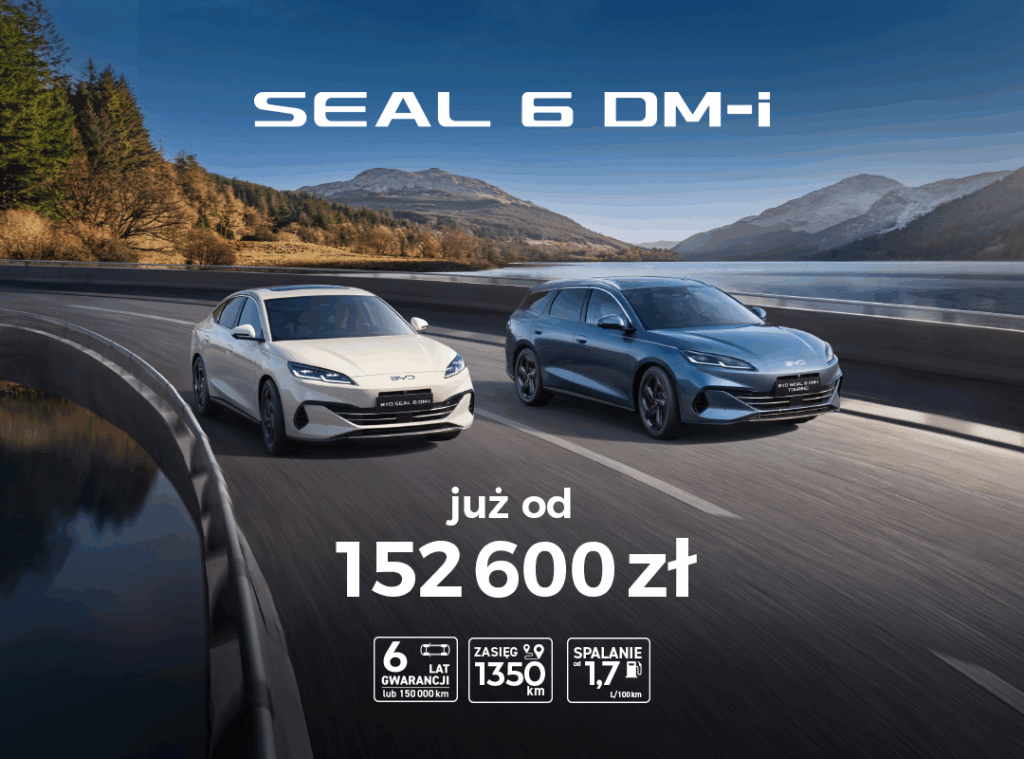 SEAL 6 DM-i Touring – przestronne, hybrydowe kombi typu plug-in, które oferuje komfort, wydajność i niskie koszty eksploatacji na co dzień. Wyposażony w zaawansowaną technologię Super DM (Dual Mode plug-in-hybrid), która zapewnia wrażenia z jazdy elektrycznej z dodatkowym wsparciem wydajnego silnika benzynowego, a łączny zasięg to nawet 1350 km. Unikalny dla BYD system Super DM oferuje osiągi na najwyższym poziomie – przyspieszenie 0-100 km/h w 8,5 sekundy – oraz wyjątkową efektywność. W cyklu mieszanym WLTP, przy spalaniu 4,8 l/100 km. W trybie wyłącznie elektrycznym przejedziesz do 100 km bez zużycia kropli paliwa.